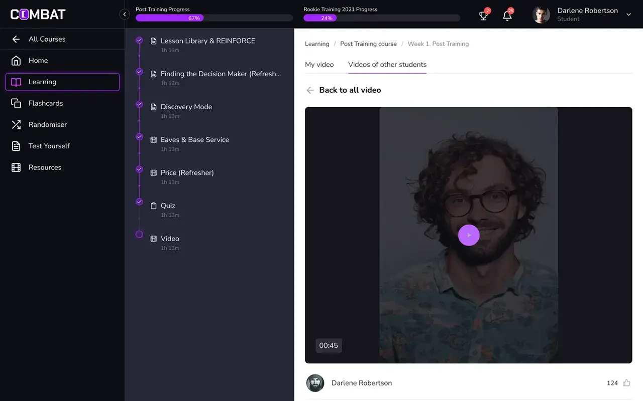 Students could see the dashboard that showed their week-by-week development, their current course's development, and flashcard progress.