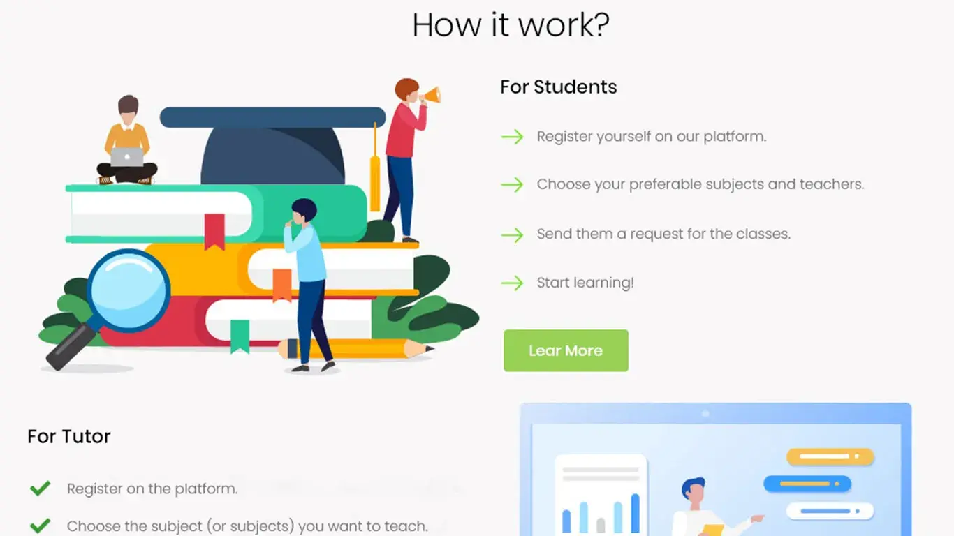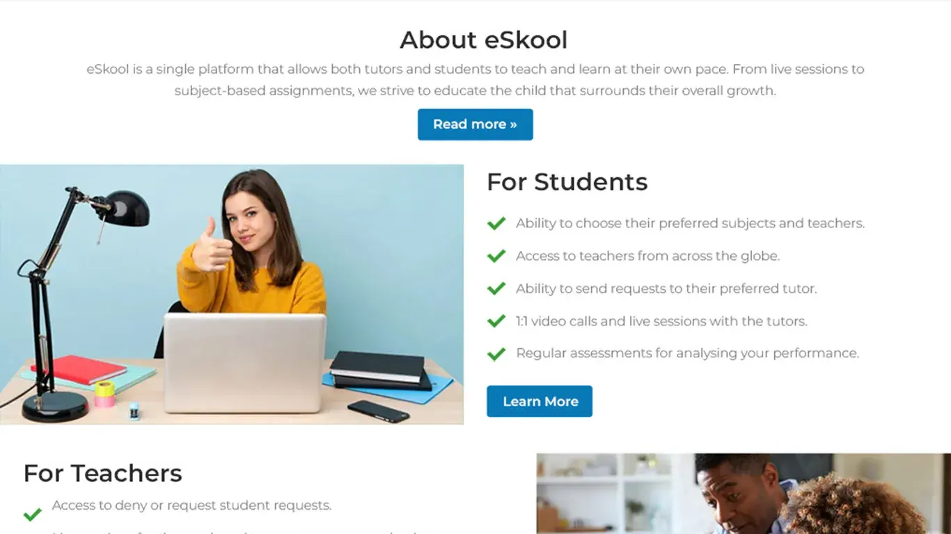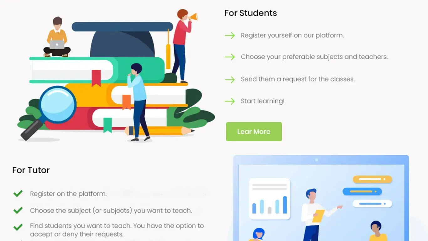 The client, who works in the education sector, wanted an eLearning platform that would connect students and teachers from all across the globe and create a centralized educational hub. The client wanted a online education platform where students could schedule their online courses with the finest tutors available, examine the homework that they have been assigned by their tutors, see their results and achievement badges depending on how well they do, and book their classes using the platform.